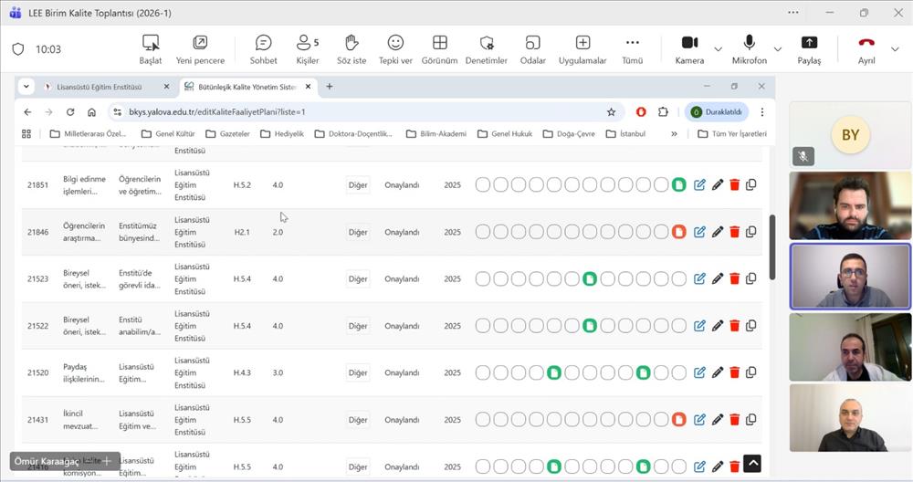 Toplantıda ilk olarak, 2025 yılına ilişkin kalite ve birim faaliyetleri değerlendirilmiştir. Ardından 2026 yılında devam ettirilmesi planlanan mevcut faaliyetlerden bahsedilmiştir. Daha sonra, komisyon üyelerimizin görüş ve önerileri doğrultusunda 2026 yılı için mevcut bazı faaliyetlerin kapsamının genişletilmesi ve yeni faaliyetler eklenmesi ele alınmıştır. Toplantıda dile getirilen hususlar doğrultusunda 2026 yılı altı aylık faaliyet planının hazırlanması kararlaştırılarak toplantı sona erdirilmiştir.