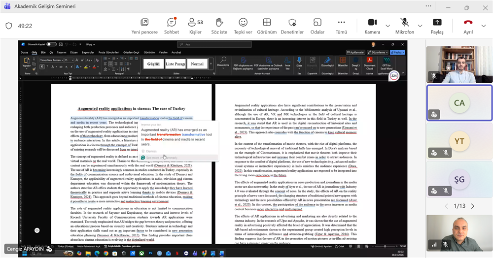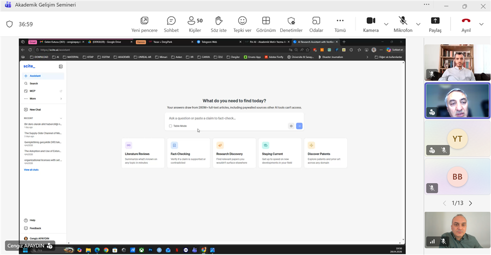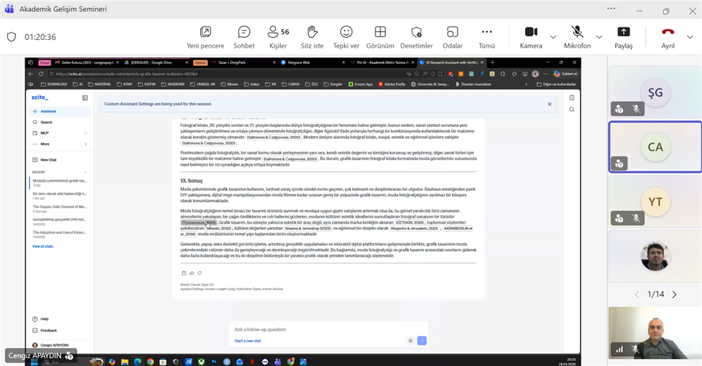 Lisansüstü Eğitim Enstitüsü'nün Akademik Gelişim Seminerleri kapsamında, Selçuk Üniversitesi öğretim görevlisi ve Rektör danışmanı Öğr. Gör. Dr. Cengiz APAYDIN tarafından "Akademik Çalışmalarda Yapay Zeka" başlıklı seminer yoğun talep üzerine 28 Nisan 2026 tarihinde ikinci kez gerçekleştirilmiştir. Seminere Enstitü Müdürü Doç. Dr. Adem TUNCER, Enstitü Müdür Yardımcıları Dr. Öğr. Üyesi Mustafa DEMİRCİ, Dr. Öğr. Üyesi Ömür KARAAĞAÇ, Enstitü Sekreteri Burçin YAVUZ, üniversitemiz akademisyenleri ve öğrencilerimiz katılım sağlamışlardır. Seminerde, akademik çalışma hazırlama aşamalarını oluşturan literatür tarama ve yazma, belge okuma, yazma, özetleme ve analiz, yazım ve dilbilgisi hatalarını düzeltme, çeviri araçları, etik kullanım ve komut iletişimi gibi konularda örnek uygulamalarla yapay zeka araçlarından nasıl yararlanılabileceği anlatıldı.