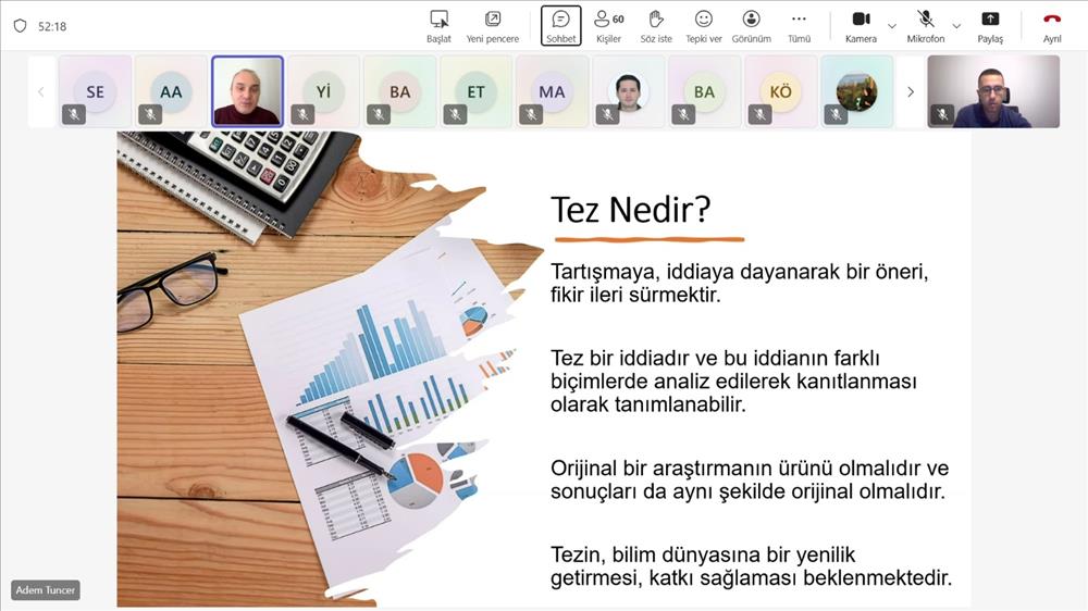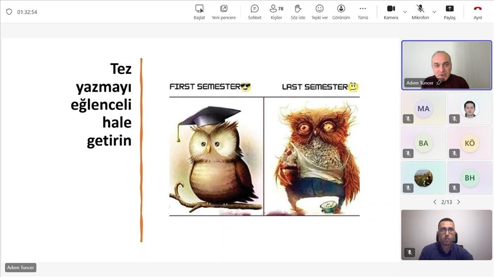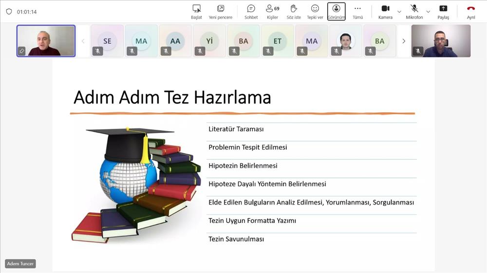 Lisansüstü Eğitim Enstitüsünün "Akademik Gelişim Seminerleri" kapsamında "Etkili ve Nitelikli Tez Yazımı: Dikkat Edilmesi Gerekenler" konulu seminer, Enstitü Müdürümüz Doç. Dr. Adem TUNCER tarafından 18 Aralık 2025 tarihinde çevrimiçi olarak verildi.