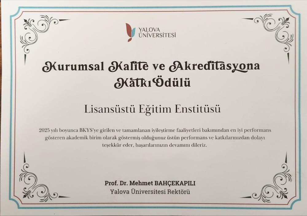 Kurumsal kalite ve akreditasyon süreci kapsamında, Kalite Yönetim Sistemi’ne girilen ve başarıyla tamamlanan iyileştirme faaliyetleri doğrultusunda en iyi performansı gösteren Enstitümüz, üniversitemiz bünyesindeki tüm akademik birimler arasında “En İyi Akademik Birim” seçilmiştir. Enstitümüz adına ödül, Rektörümüz Prof. Dr. Mehmet Bahçekapılı tarafından Enstitü Müdürümüz Doç. Dr. Adem Tuncer’e takdim edilmiştir.